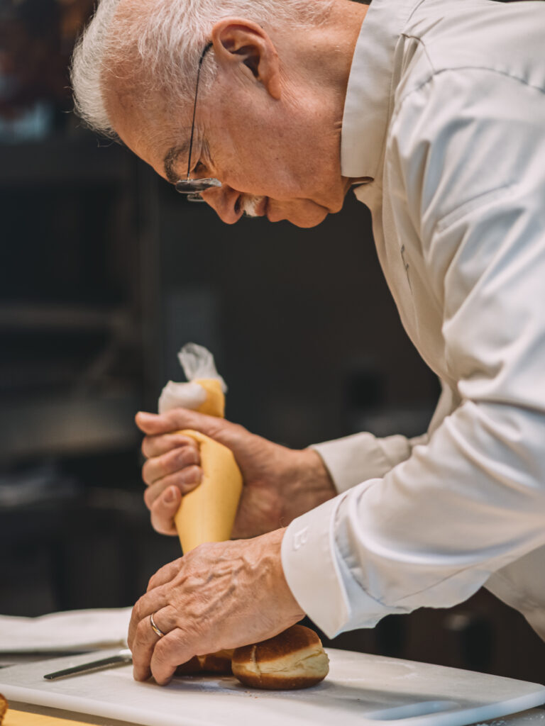 Per l’appuntamento di febbraio, Digifico ha scelto di invitare Gino Fabbri, maestro pasticcere che rappresenta un punto fermo della tradizione dolciaria italiana. Il dialogo tra i due si è tradotto in un percorso che ha alternato memoria e contemporaneità, senza forzature, lasciando spazio alla materia prima e alla tecnica. Fabbri ha portato in tavola preparazioni che parlano un linguaggio rassicurante e familiare. La ciambella con zabaione, classica e ben calibrata, ha restituito l’idea di una pasticceria che non ha bisogno di eccessi per convincere. I krapfen con crema pasticcera hanno giocato sulla fragranza e sulla pienezza della farcitura, mentre i calzoni spinati e prosciutto sono stati una nota salata capace di ampliare il racconto del mattino, riportando la colazione a una dimensione più completa.